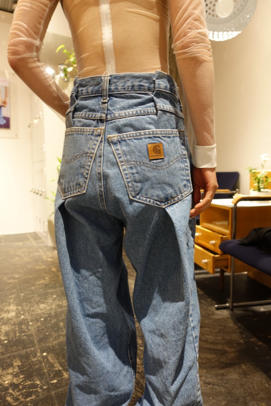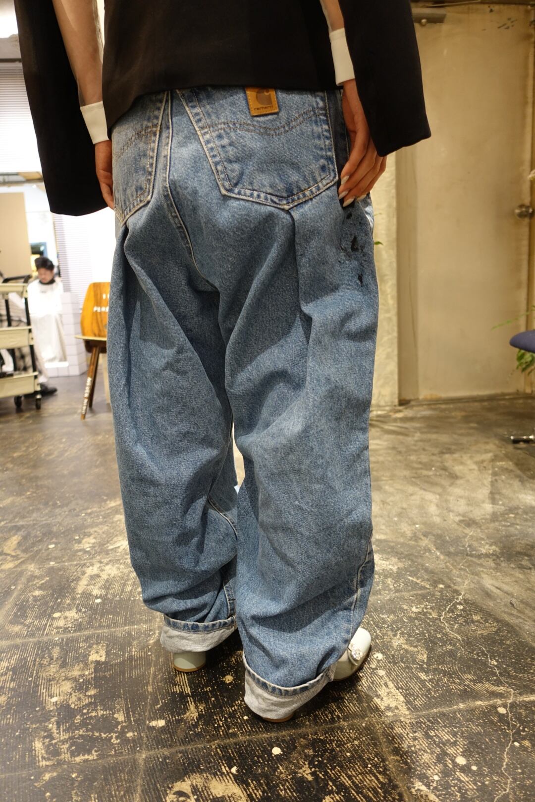 元は40インチのペインターパンツを30インチほどになる様にタックを入れてシルエットを変えてデザインを再構築しております。
